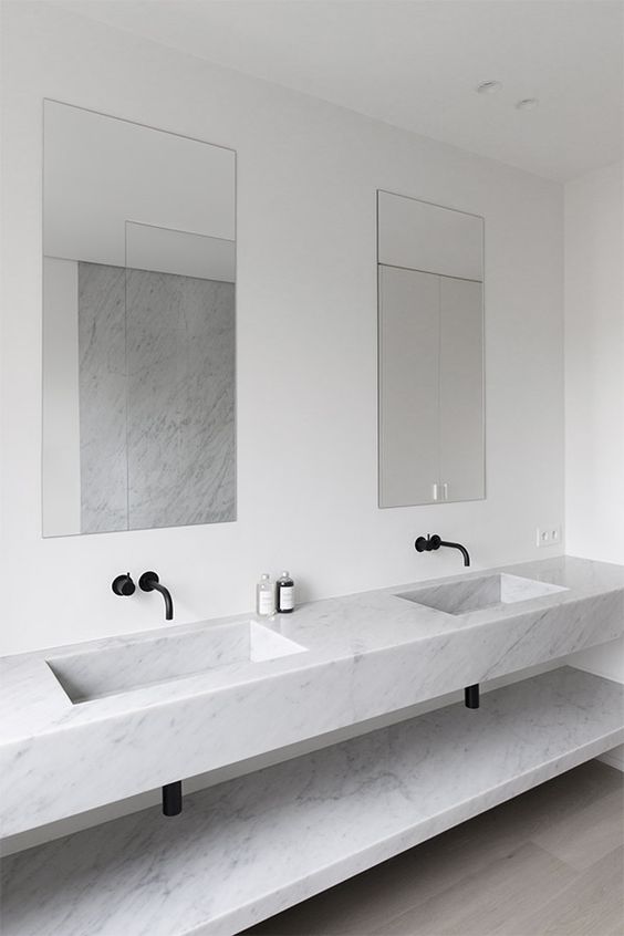 Baie minimalista marmura cu lavoar dublu si baterii negre incastrate